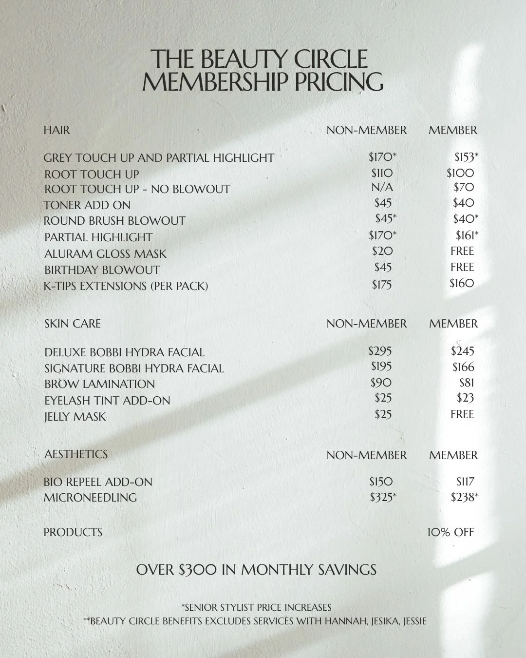 Beauty Circle members will receive preferred pricing on our most in-demand salon services and products as part of their membership. Every partial highlight, root touch up, facial, microneedling, brow tint, and many more services are included with membership pricing. It will be easier than ever to lock in consistency in your beauty routine.